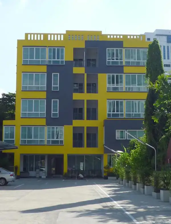 エカマイソイ12を入ってすぐの黄色の外観が目印のアパートメントです。お部屋は白を基調とした、シンプルな内装。スタジオタイプにはキッチンの設備がありません。