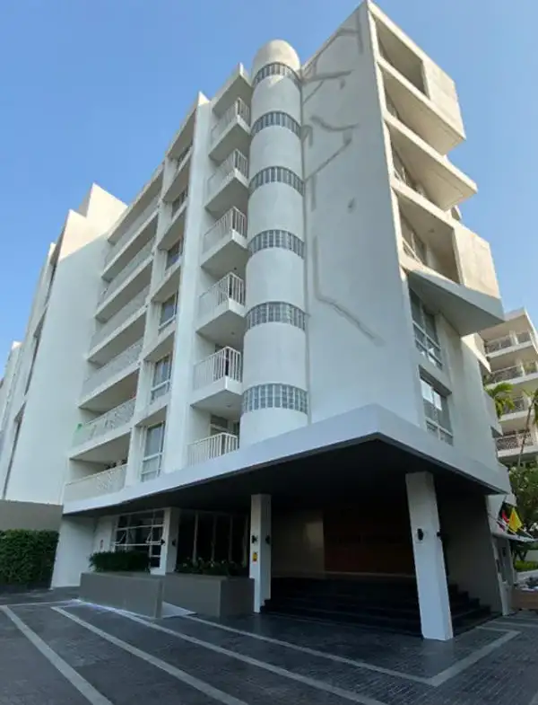 エントランスを入り、いい感じのロビーを抜けると、ヤシの木とプールがある南国ならではの素敵な中庭の風景が眼前に広がります。この広い中庭の両脇に7階建ての白亜の建物が2棟そびえています。